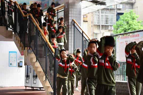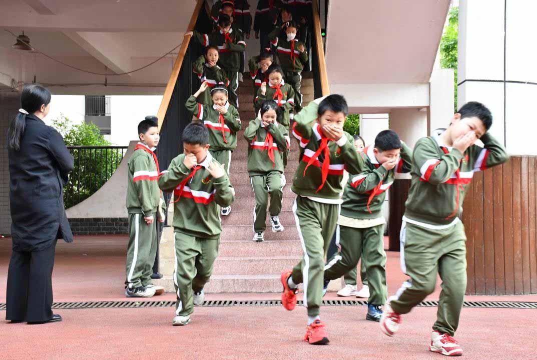 上午8点20分,紧急疏散警报声准时响起,演练正式启动。全校师生迅速进入应急状态,各班学生在班主任及任课教师的引导下,严格遵循学校预设疏散路线,低头弯腰、用湿毛巾或衣袖捂住口鼻,快速、有序、安静地撤离教室。各楼层、楼梯口、拐角处的值守教师提前到位,认真疏导人流,提醒学生保持间距、严防拥挤,全程秩序井然、规范高效。